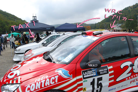 グラウンド入り口には、パーツメーカーなどのテントブースとデモカーが並ぶ。